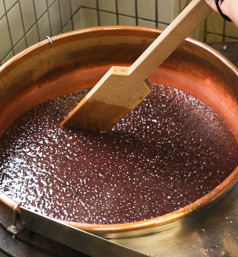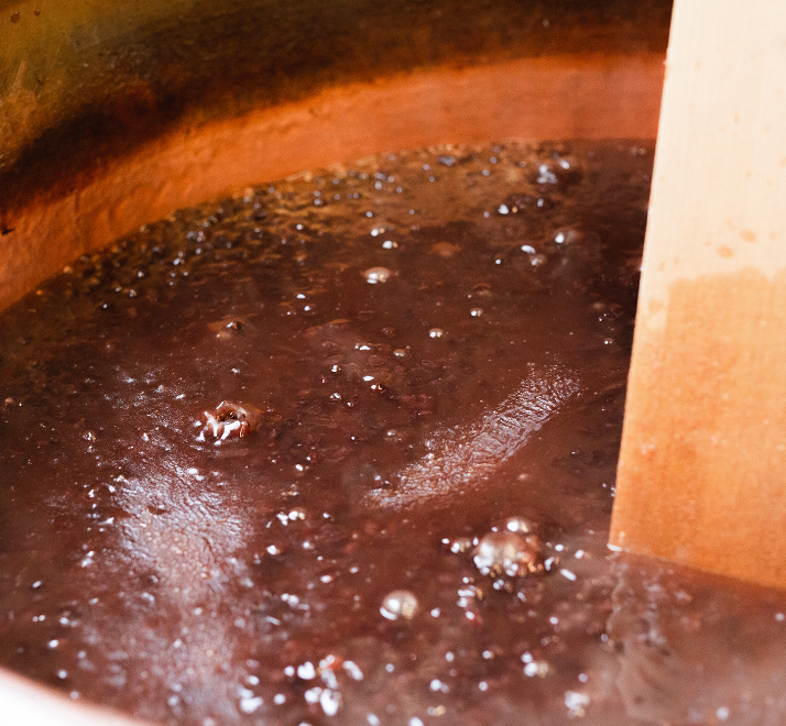 もなか種との調和を考え、餡炊きの小豆の状態を見極めて最中餡としてバランスの良い粒あんを目指しています。